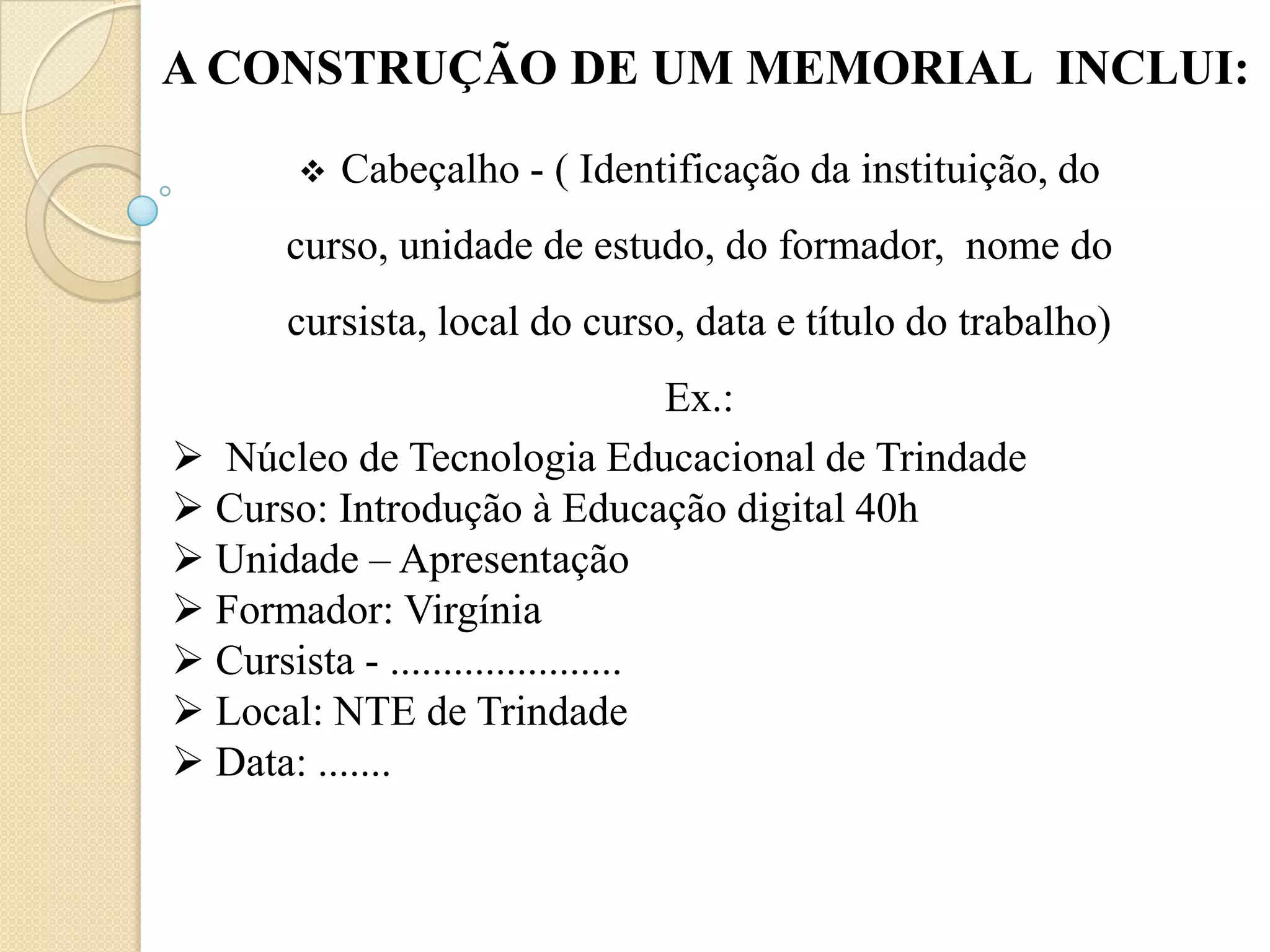 Um memorial deve incluir um cabeçalho com informações de identificação como a instituição, curso, unidade de estudo, formador, nome do aluno, local e data. O cabeçalho é seguido por um exemplo com detalhes específicos de um curso introdutório sobre educação digital no Núcleo de Tecnologia Educacional de Trindade.