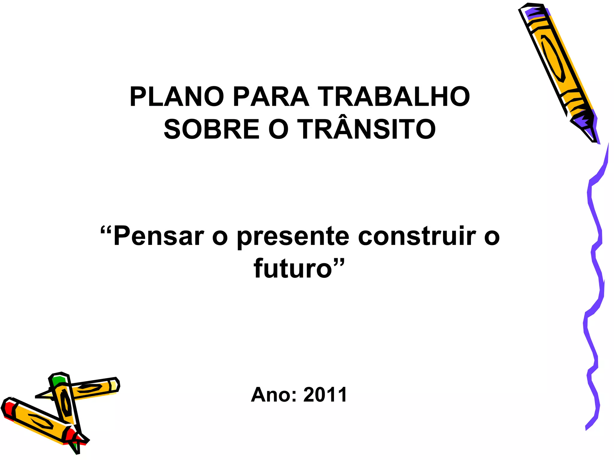 Este documento apresenta um plano de trabalho sobre trânsito para alunos da educação infantil ao 5o ano do ensino fundamental. O plano inclui objetivos de ensinar condutas seguras no trânsito através de práticas e teoria, conteúdos sobre sinais, segurança e comportamentos, e situações didáticas como simulações no pátio da escola.
