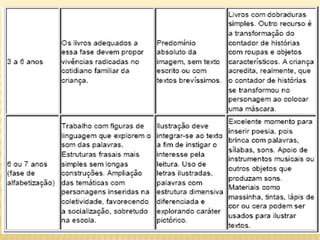 O documento discute a história e características dos livros infantis, desde seu surgimento no século XVIII até autores contemporâneos. Apresenta também críticas a práticas comuns na literatura infantil que podem "imbecilizar" as crianças, como o uso excessivo de rimas, moralismos e ilustrações meramente literais. Por fim, fornece dicas sobre a composição de livros, incluindo a estrutura do texto, uso de cores e criação de personagens.