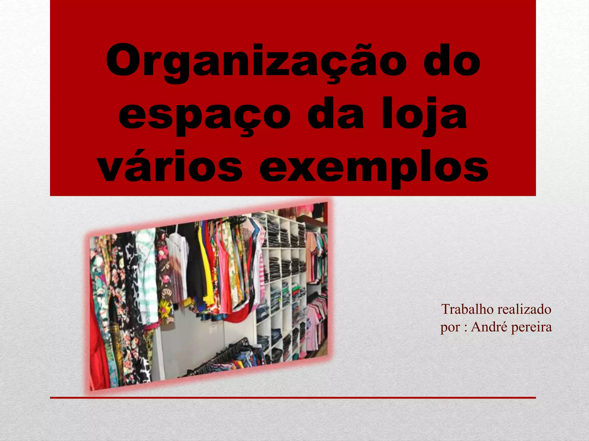 O documento discute a organização do espaço da loja, fornecendo exemplos de lojas bem e mal organizadas. O trabalho foi realizado por André Pereira e discute como a organização do espaço de uma loja pode afetar positiva ou negativamente a experiência do cliente.