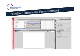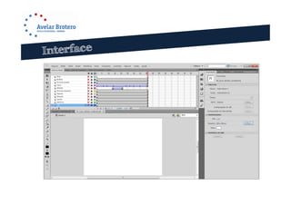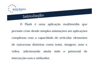1) O documento descreve as principais funcionalidades e ferramentas do Adobe Flash para criação de animações 2D, incluindo a capacidade de importar vários formatos de imagens e vídeo.