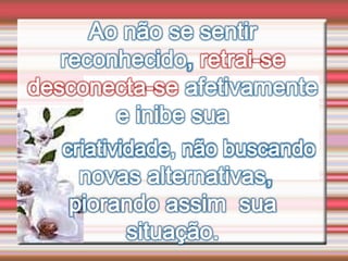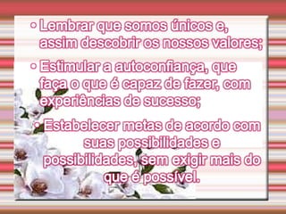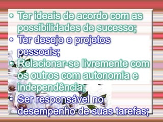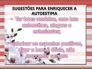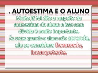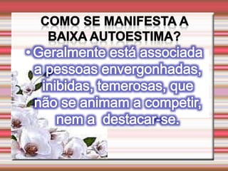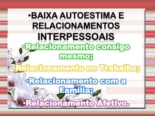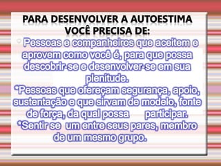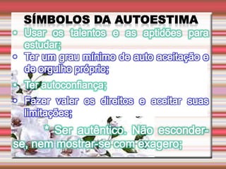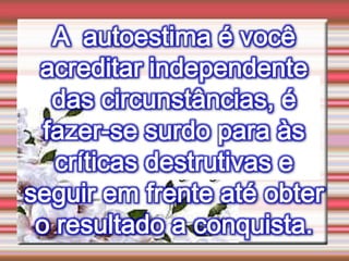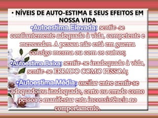 O documento discute a autoestima e como ela determina nosso destino, sucesso ou fracasso. Ele define autoestima e autoconceito, e discute distorções e distúrbios da autoestima, incluindo uma infância mal resolvida e oscilações da autoestima que podem levar a problemas de conduta. Também aborda a conquista da autoestima fundamental.