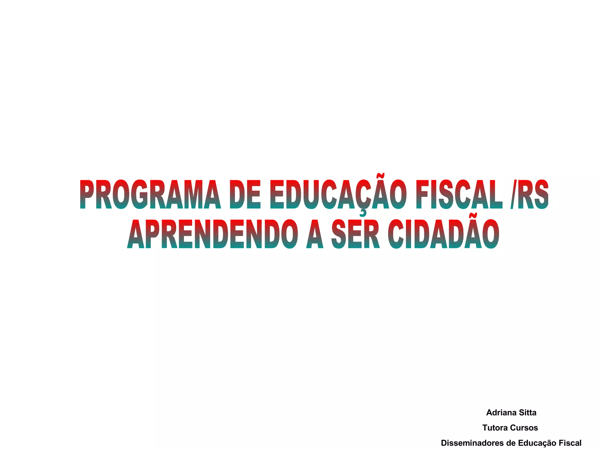 Este documento descreve um programa de educação fiscal no Rio Grande do Sul com o objetivo de contribuir para a formação do cidadão através de conhecimentos sobre administração pública, arrecadação de impostos e seu uso. O programa visa levar esses conhecimentos a escolas, universidades e a sociedade em geral para criar uma relação harmoniosa entre o Estado e o cidadão, combater sonegação e incentivar a fiscalização do uso dos recursos públicos.