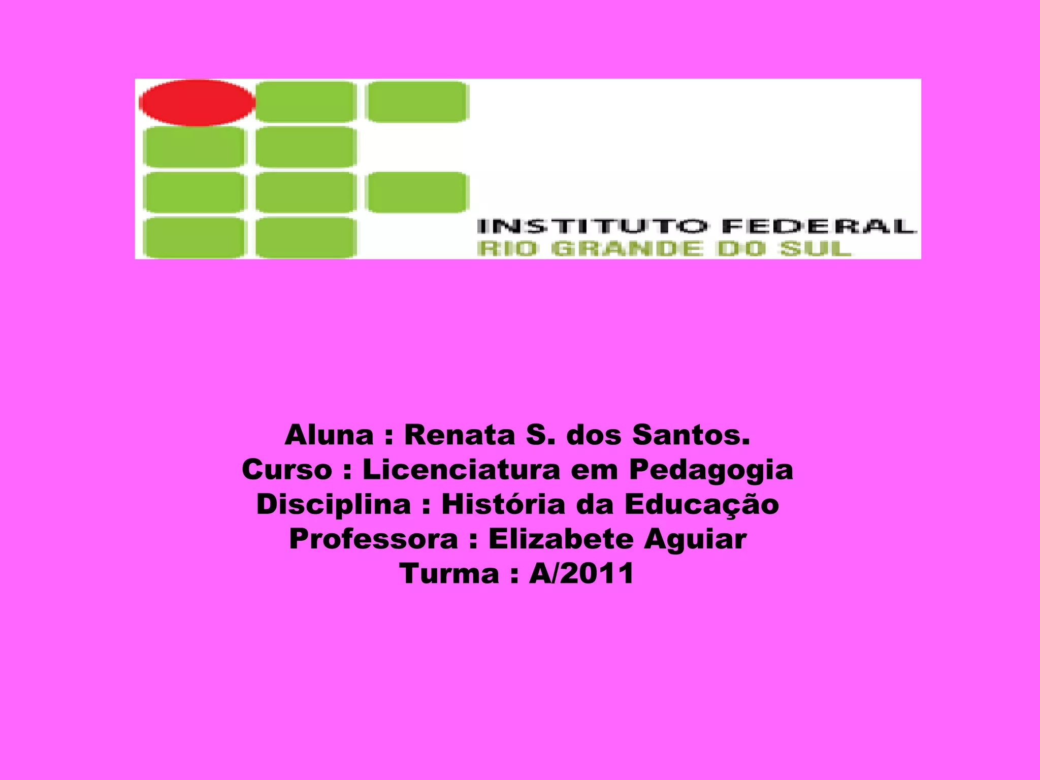 Renata dos Santos, de 25 anos, narra sua história de vida. Ela nasceu em Sapucaia do Sul no Rio Grande do Sul e atualmente trabalha como professora em Canoas e estuda Pedagogia no IFRS. Renata teve uma infância normal, gosta de cultura gaúcha e sempre sonhou em ser professora. Atualmente está noiva e pretende se formar em Pedagogia para poder transformar vidas através da educação.