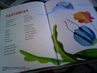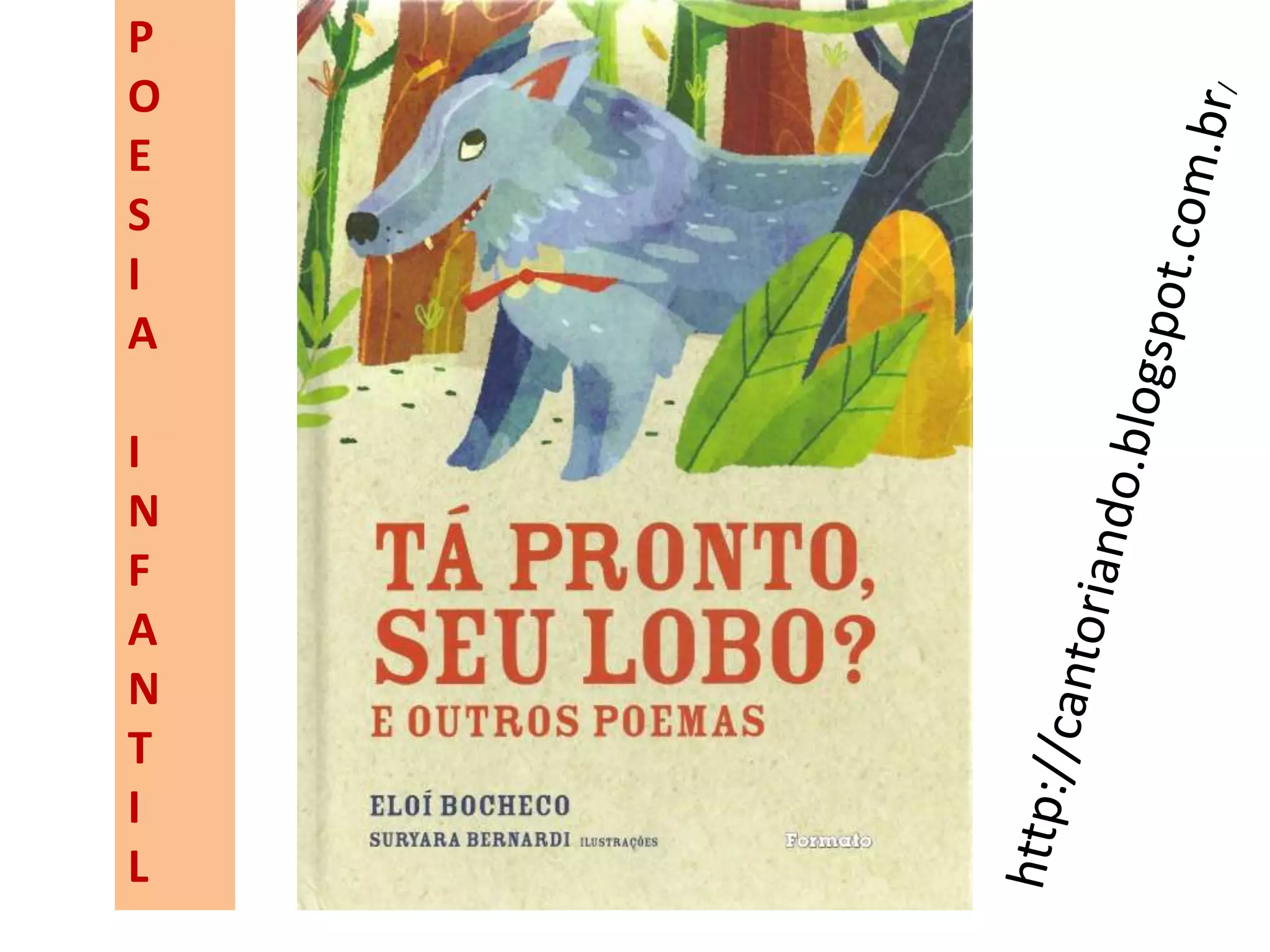 O livro de poesia infantil apresenta poemas que refletem experiências afetivas e brincadeiras com a linguagem, incluindo o poema-título 'tá pronto seu lobo?' e o primeiro poema da carreira, 'flauta florida'. A obra é inspirada no folclore e explora temas como plantas, flores, e desafios poéticos. A poesia é descrita como uma fonte de luz, alimento e abrigo.