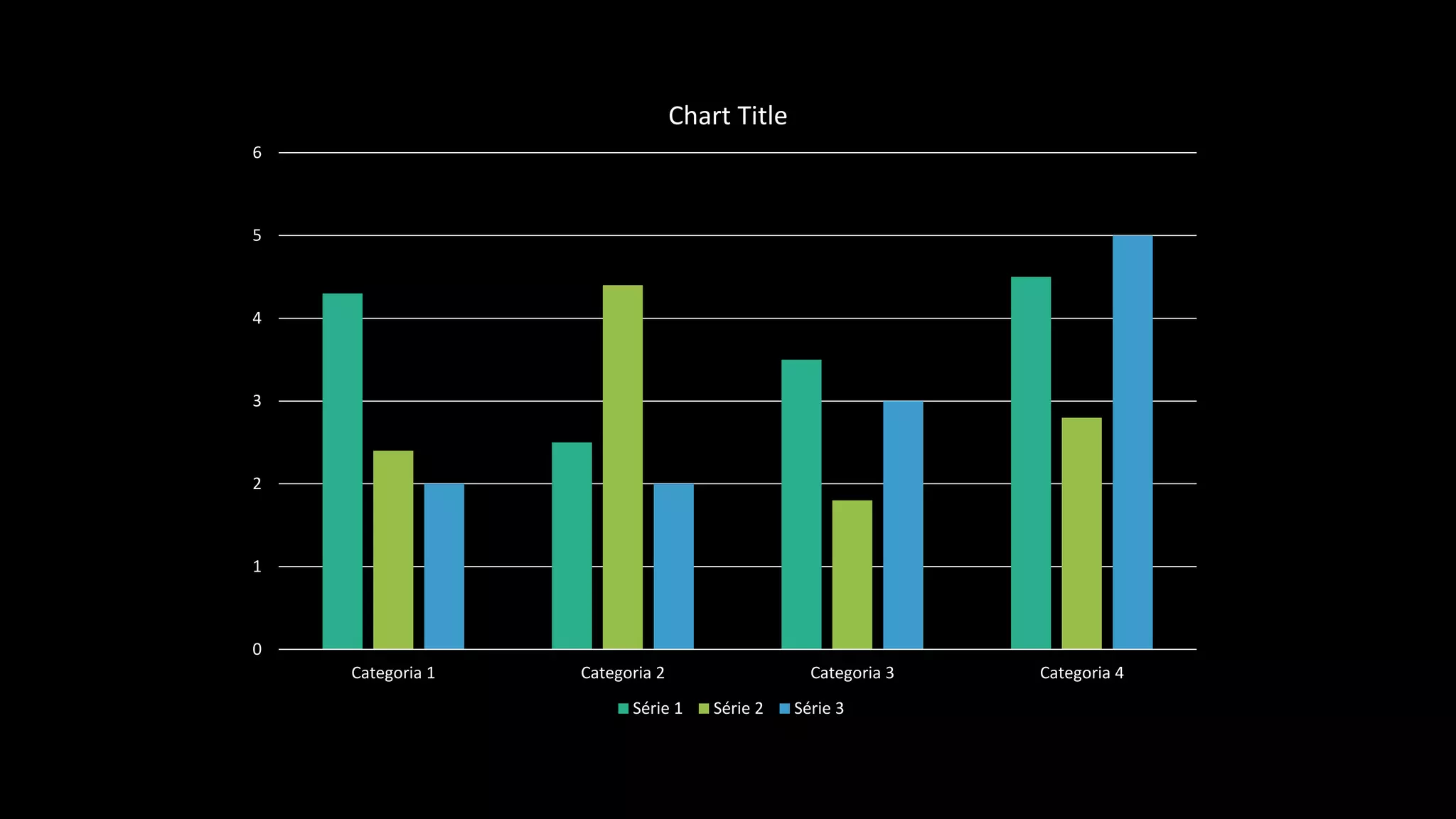 O gráfico mostra quatro categorias com três séries de dados numéricos. As séries 1, 2 e 3 apresentam valores decrescentes de 6 a 0 nas categorias de 1 a 4.