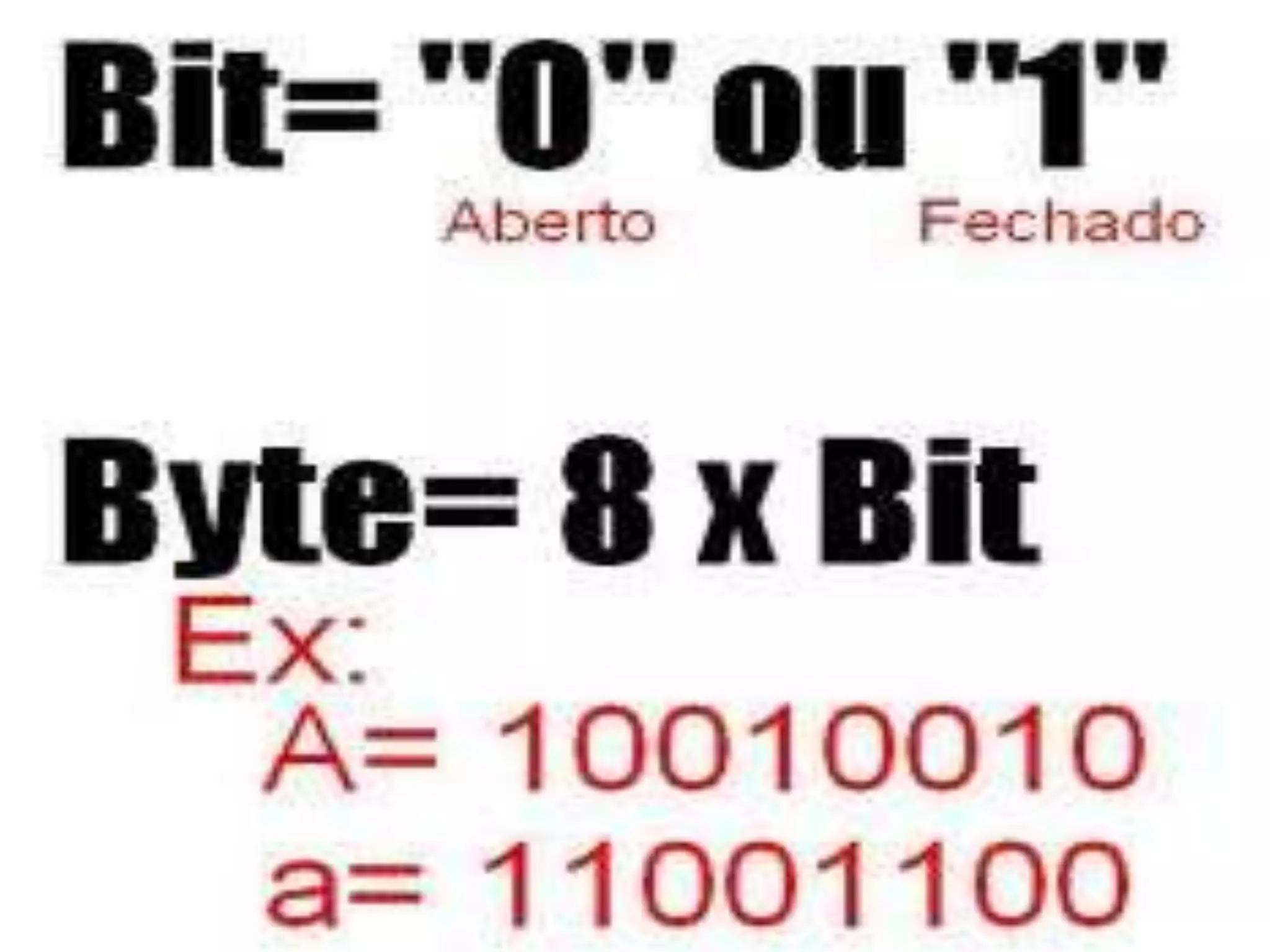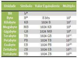 Um bit é a menor unidade de informação armazenada em computadores, podendo assumir os valores 0 ou 1. Um conjunto de 8 bits forma um byte, permitindo representar 256 números binários. Formatos como JPEG para imagens e MP3 para música comprimem arquivos para reduzir seu tamanho sem prejudicar muito a qualidade.