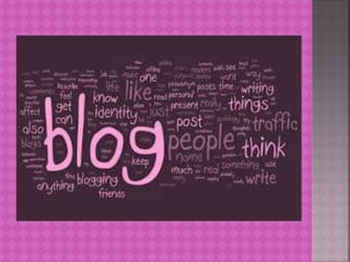 Um blog é um site cuja estrutura permite atualizações rápidas através de posts, que são artigos organizados de forma cronológica inversa focados na temática do blog. Blogs permitem comentários e interação entre leitores e autores, e evoluíram a partir de diários online manuais para ferramentas que facilitam a produção e manutenção de conteúdo.