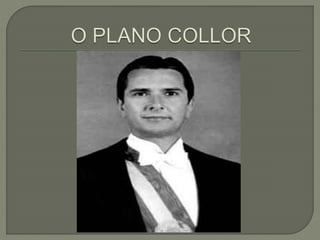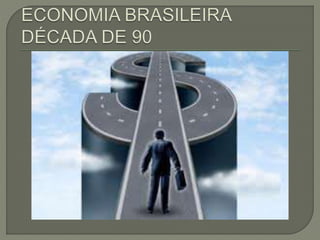 O documento resume eventos culturais, políticos e econômicos importantes da década de 1990 no Brasil, incluindo o segundo Rock in Rio em 1991, a morte do grupo Mamonas Assassinas em 1995, o sucesso de bandas e cantores de rock nacional, os prêmios de Steven Spielberg em 1994, as comemorações dos 500 anos do Descobrimento da América em 1992 e o lançamento do primeiro livro de Harry Potter em 1997. Também discute as crises econômica e política durante o governo Collor, como recessão, desemprego e