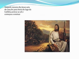Jesus ensinou uma multidão à beira do lago da Galiléia sobre a parábola do semeador, explicando como diferentes tipos de solo afetam o crescimento das sementes, representando como as pessoas recebem suas palavras.