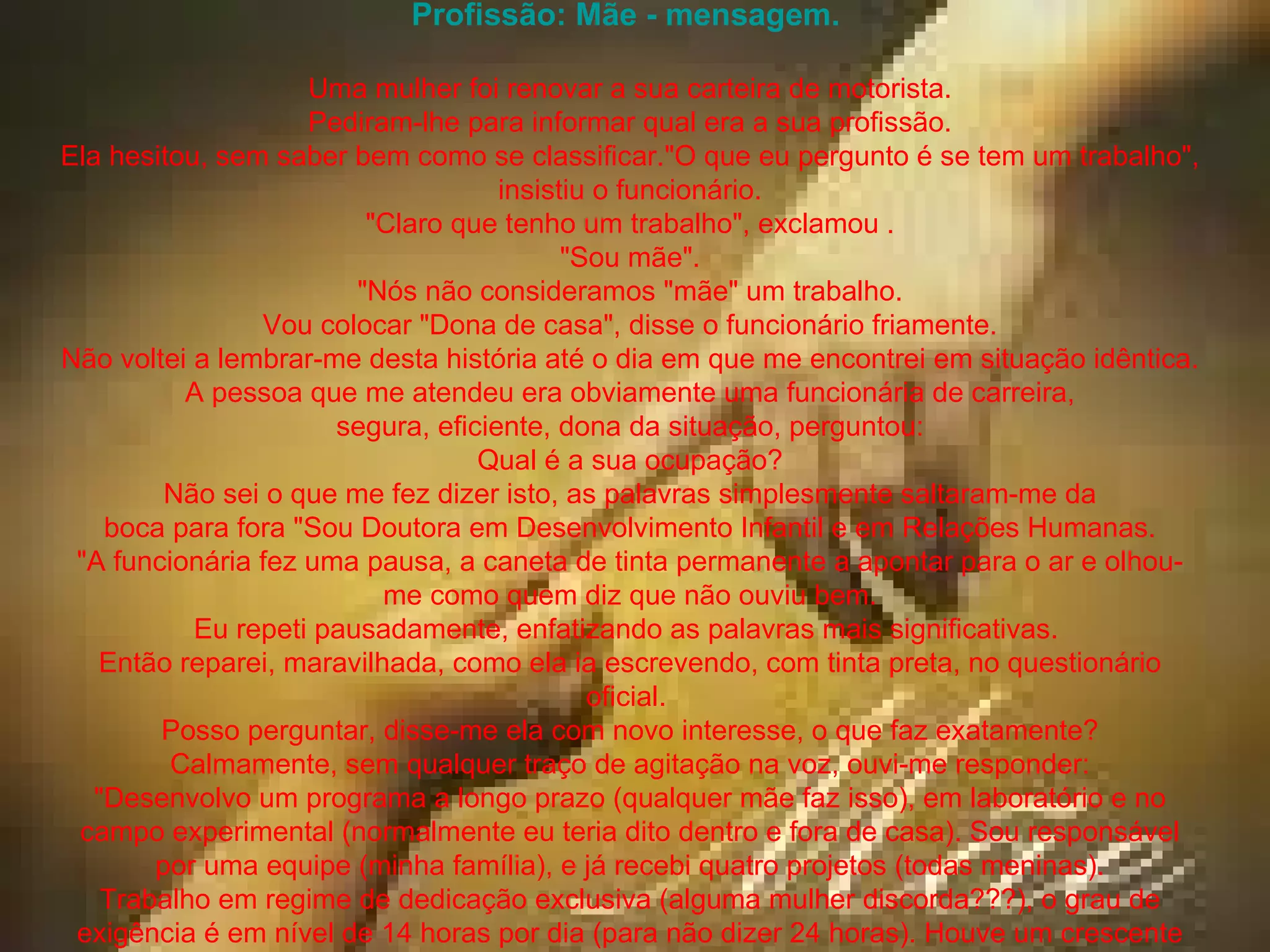 Uma mulher hesitou em classificar sua profissão como "mãe" ao renovar sua carteira de motorista. Mais tarde, ela se descreveu como "Doutora em Desenvolvimento Infantil e em Relações Humanas" ao descrever seu trabalho criando e cuidando de sua família, e foi tratada com maior respeito. Ela reflete sobre como a maternidade é uma carreira gloriosa.