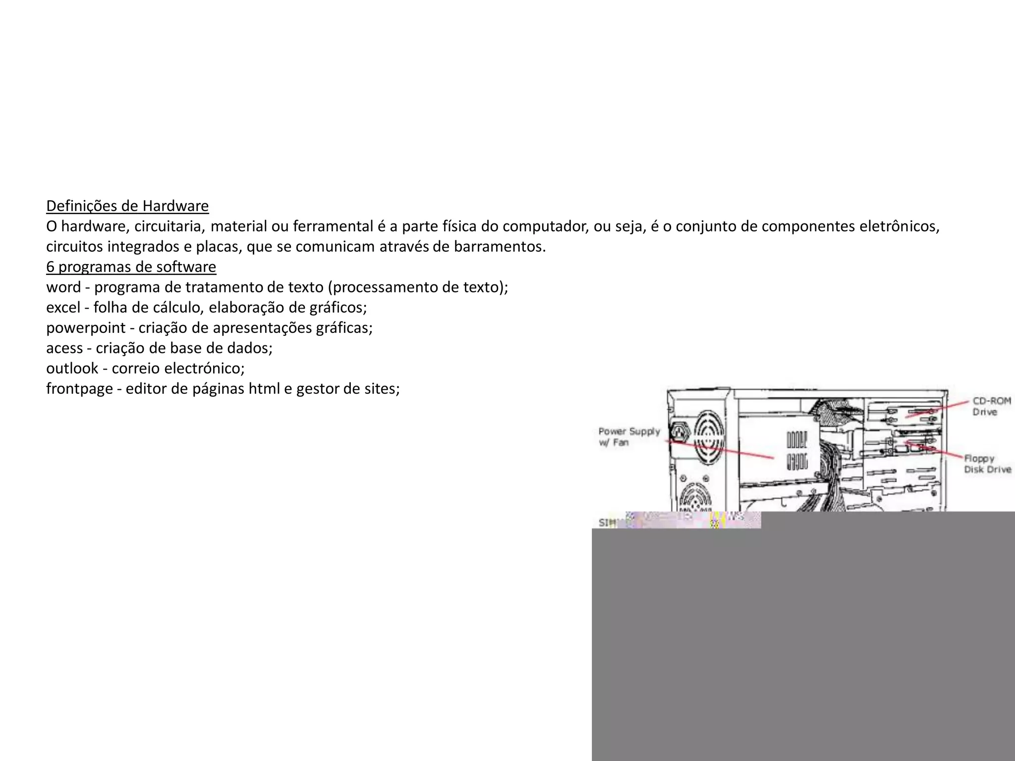 O hardware é composto por componentes eletrônicos e circuitos que compõem a parte física do computador, incluindo o microprocessador, disco rígido, periféricos, softwares, BIOS e barramentos. O documento lista os principais componentes de hardware e exemplos como placas de vídeo, teclado, monitor e impressora.