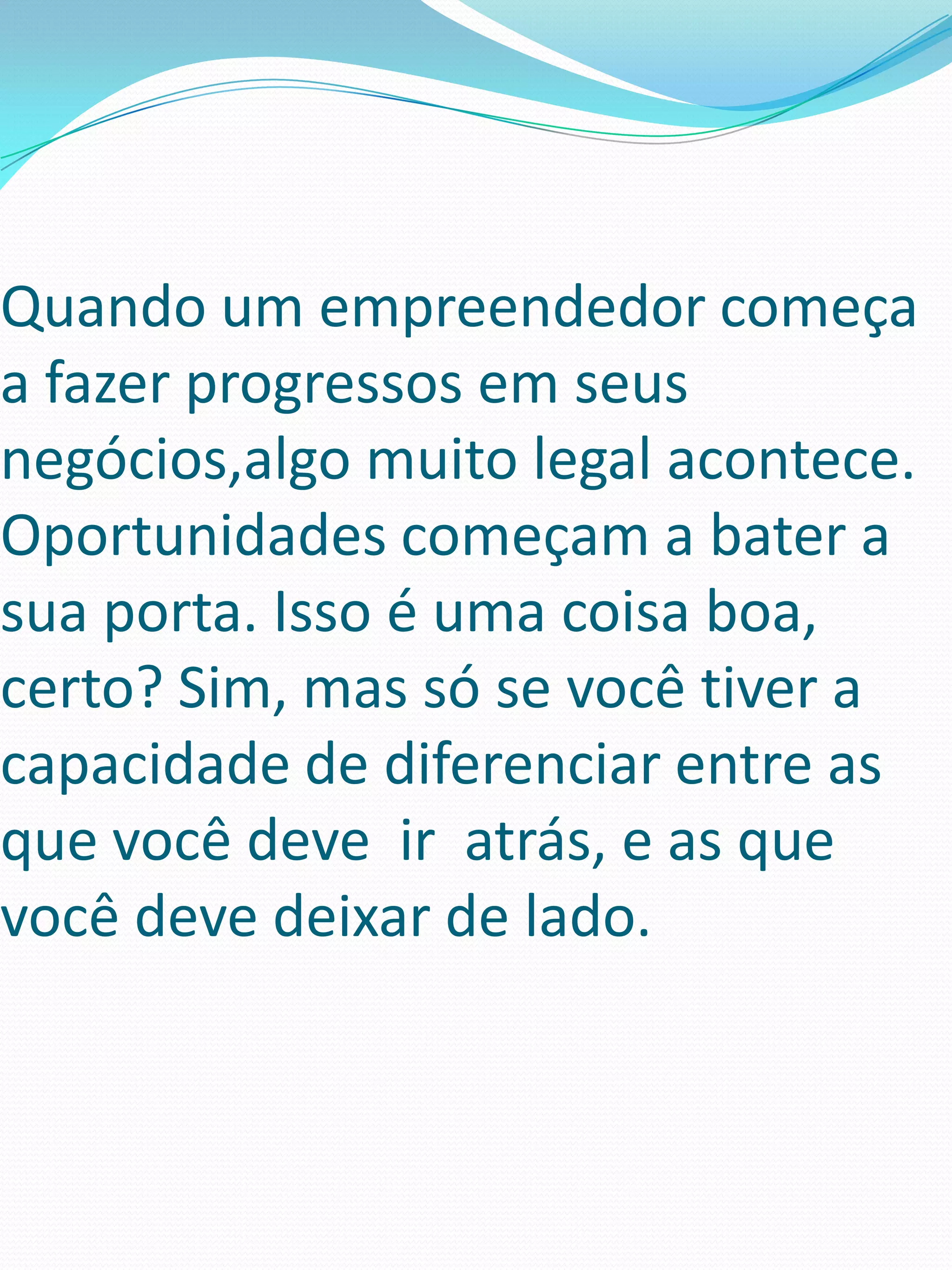 Quando um empreendedor começa a ter sucesso, novas oportunidades surgem. Porém, é importante escolher cuidadosamente quais oportunidades seguir e quais deixar de lado para continuar progredindo com o negócio.
