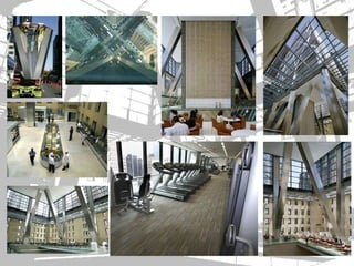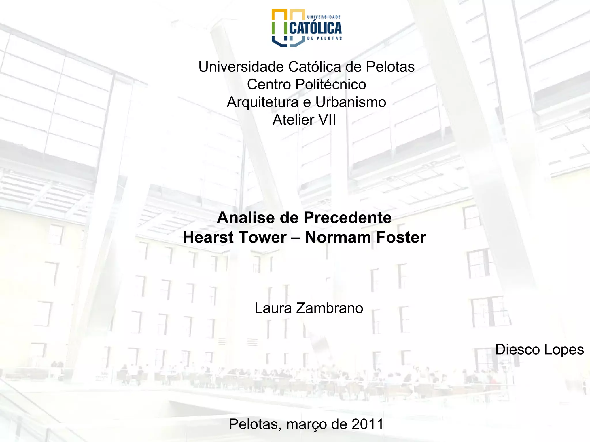 O documento resume a carreira do arquiteto Norman Foster e analisa a Hearst Tower, seu projeto em Nova York. A torre foi construída em 2003-2006 para sediar a Hearst Corporation, utilizando aço reciclado e soluções sustentáveis que lhe renderam prêmios de sustentabilidade. Sua estrutura em malha diagonal economizou aço e criou uma silhueta única.