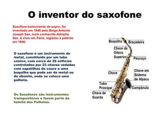 O saxofone foi inventado em 1840 pelo belga Adolphe Sax. É um instrumento de metal com cerca de 26 orifícios controlados por 23 chaves que vem em vários tamanhos, desde o sopranino até o baixo. O saxofone é amplamente utilizado em bandas sinfônicas, orquestras, bandas filarmônicas e grupos de jazz.