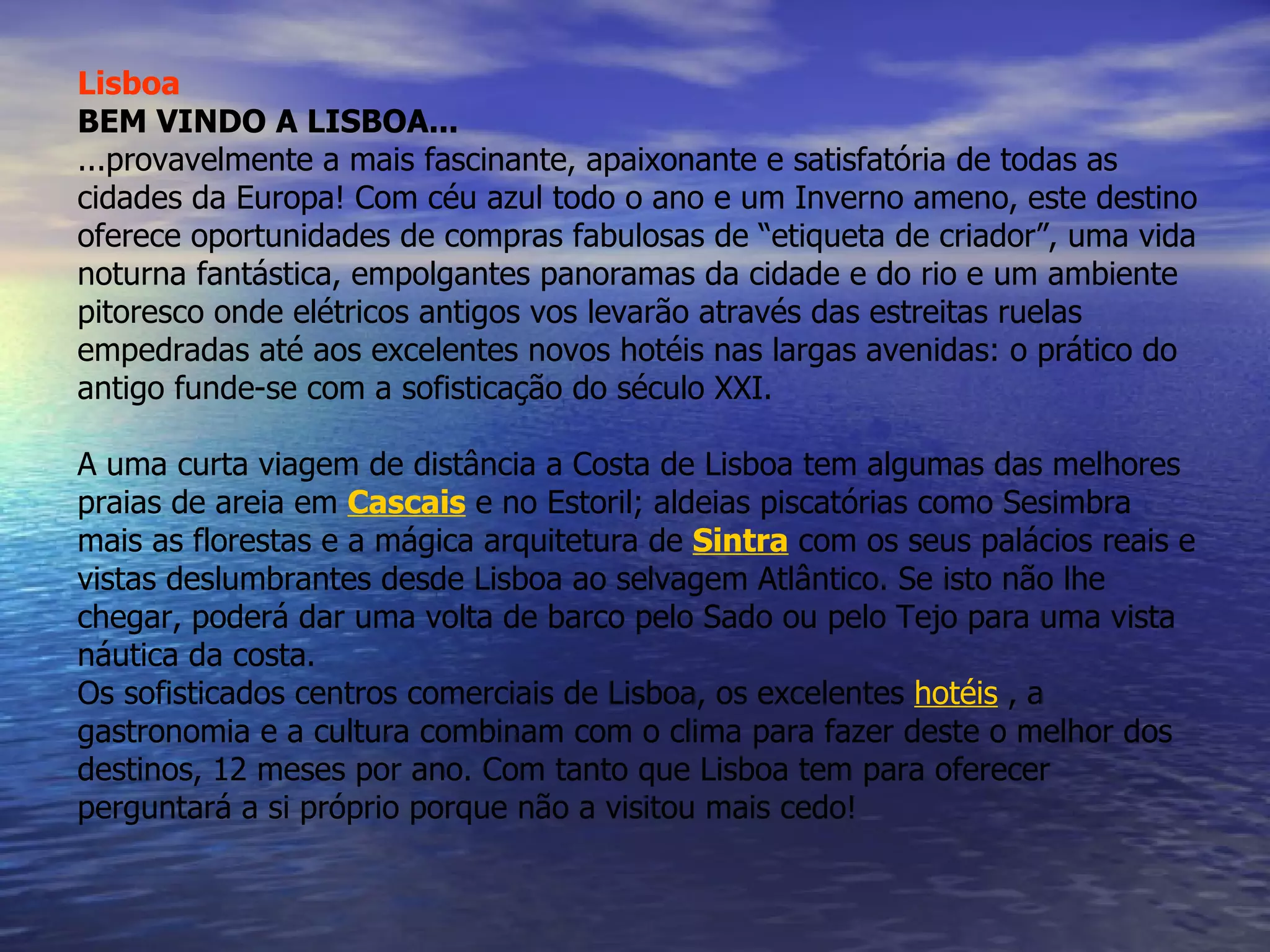 Este documento fornece uma introdução positiva à cidade de Lisboa, Portugal. Ele descreve Lisboa como uma cidade fascinante com bom clima, cultura rica, ótimas opções de compras, vida noturna animada e paisagens deslumbrantes. O documento também lista vários locais populares para visitar em Lisboa e recomenda alguns hotéis de alto nível.