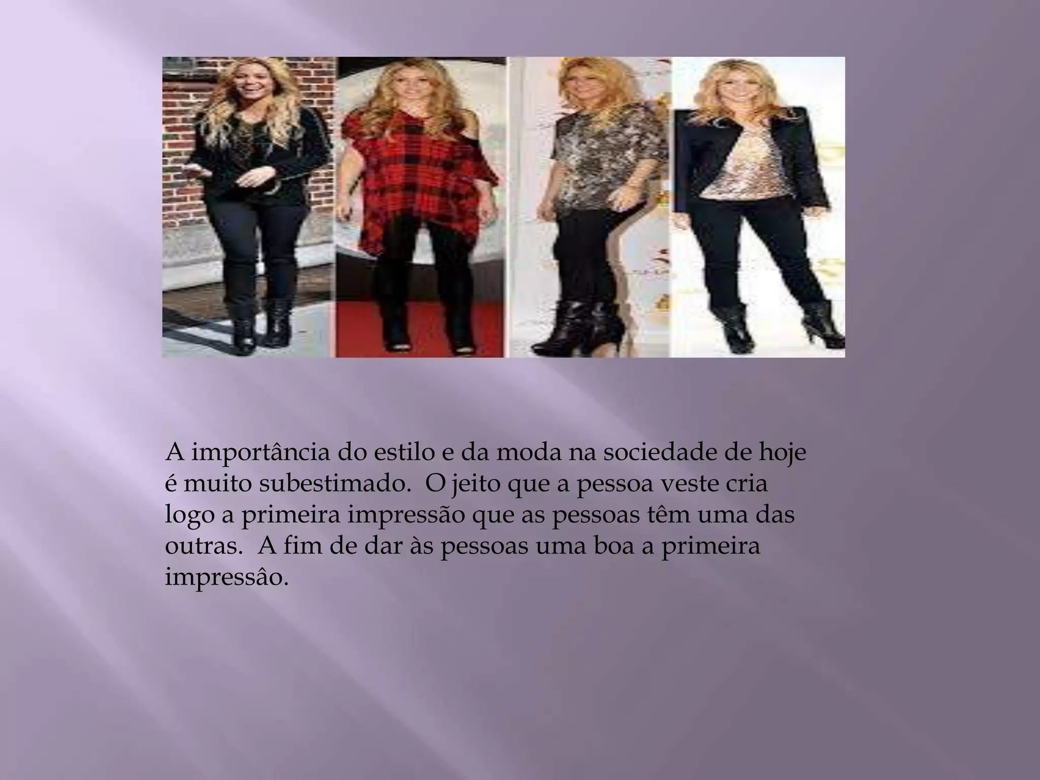 O documento discute a importância da moda e do estilo pessoal na primeira impressão que as pessoas têm umas das outras, argumentando que o jeito como nos vestimos cria logo a primeira impressão e que devemos nos vestir bem para dar uma boa primeira impressão e não parecer desleixados ou sujos.