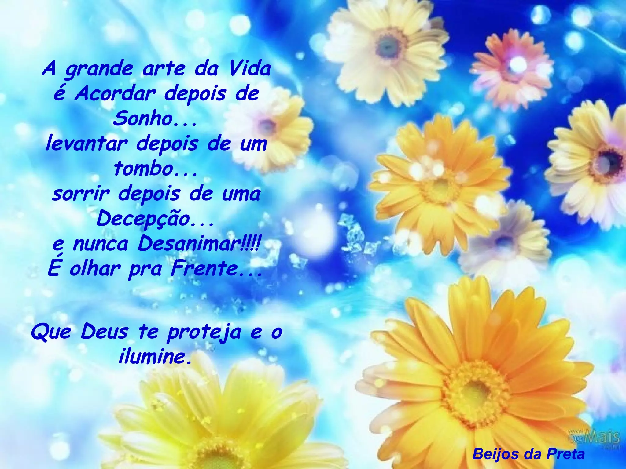 A grande arteda Vida é Acordar depois de Sonho... levantar depois de um tombo... sorrir depois de uma Decepção... e nunca Desanimar!!!! É olhar pra Frente... Que Deus te proteja e o ilumine. Beijos da Preta