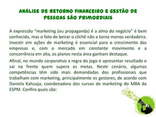 O documento discute as principais competências demandadas de profissionais de marketing, especialmente gestores, de acordo com uma coordenadora de cursos de marketing. Essas competências incluem a transformação de dados em insights, o domínio de storytelling, e a gestão de pessoas. Além disso, destaca a importância do conhecimento de plataformas digitais e a análise do retorno financeiro de campanhas de marketing.