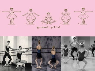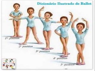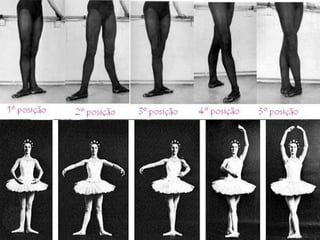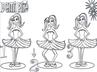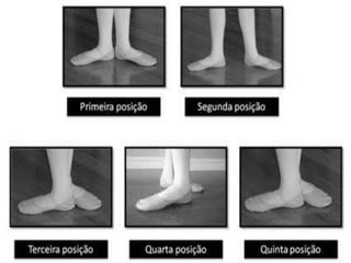 O documento descreve quatro posições básicas de ballet: demi-plié, tendu, arabesque e passé. Demi-plié envolve flexionar os joelhos mantendo os calcanhares no chão. Tendu estica uma perna para frente, lado ou atrás com os ossos dos quadris alinhados aos ombros. Arabesque mantém uma perna esticada atrás e a outra pode estar esticada ou não com ombros e quadris virados para frente. Passé passa um pé pela perna de apoio até a altura do