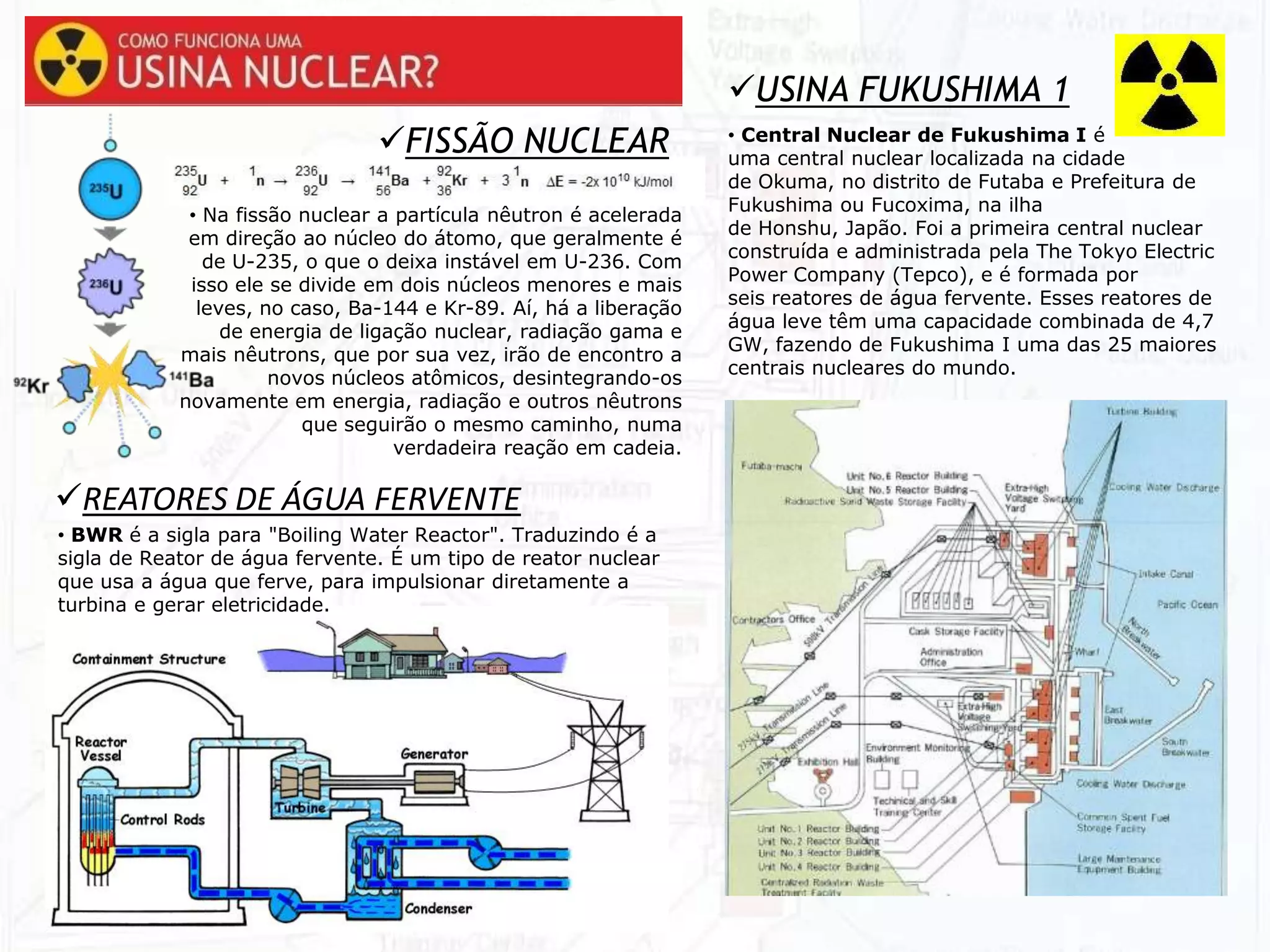 O documento discute o acidente nuclear na usina de Fukushima no Japão em 2011, causado por um terremoto e tsunami. Detalha os riscos da radiação nuclear para a saúde e como se proteger dela. Também resume que a rápida evacuação de pessoas próximas à usina evitou maiores riscos à saúde por exposição radioativa.