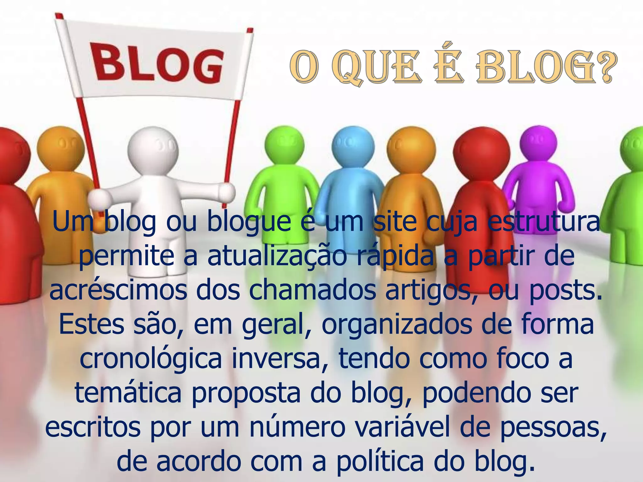 Um blog permite atualizações rápidas de artigos ou posts organizados de forma cronológica inversa sobre uma temática proposta. O termo "blog" foi criado em 1999 a partir da abreviação da palavra "weblog" para significar editar ou postar em um site desse tipo. Blogs diferem de sites por serem mais informais e permitirem autonomia total para publicar opiniões, como em uma conversa entre amigos.
