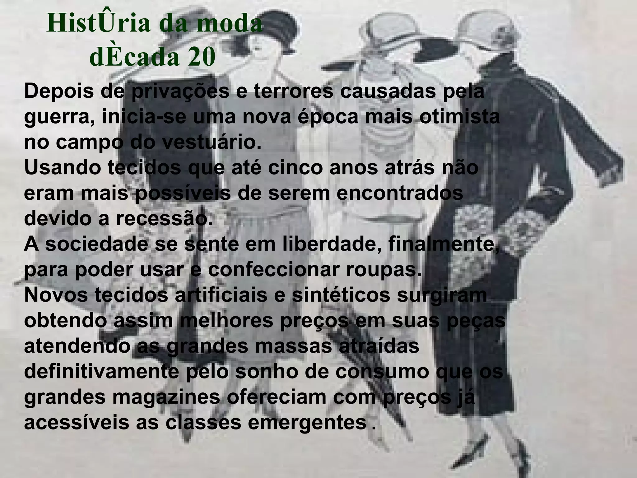 A década de 1920 trouxe uma nova era mais otimista para a moda após a Primeira Guerra Mundial, com tecidos que antes eram escassos agora disponíveis a preços acessíveis para as classes emergentes. As saias ficaram mais curtas e os vestidos leves e drapeados refletiam a geometria e arte da época, enquanto os cabelos curtos e chapéus sinalizavam a liberdade das mulheres dos espartilhos apertados do passado.