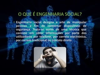 O documento discute engenharia social, que é a arte de manipular pessoas para obter informações confidenciais através de técnicas como ligar para alguém fingindo ser outra pessoa, enviar e-mails ou correio, usar redes sociais ou aproveitar erros de digitação. Algumas formas comuns de ataque incluem ligar para funcionários se passando por colegas, usar a linguagem da empresa, ouvir música de espera e explorar erros no ambiente de trabalho. A melhor proteção é ter cuidado com o que se compartilha e sempre