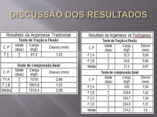 Este documento discute a substituição da areia e da cal pela fosfogesso na composição de argamassas. O fosfogesso é um resíduo gerado pela indústria de fertilizantes em grandes quantidades anualmente. O documento apresenta testes realizados em universidades que compararam argamassas tradicionais e de fosfogesso, mostrando que a substituição é viável e pode ajudar no gerenciamento adequado desse resíduo.