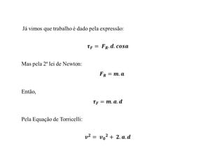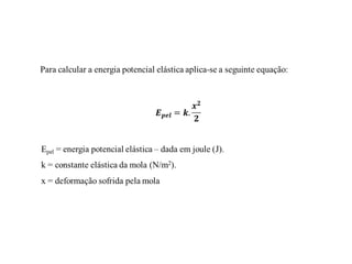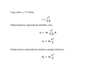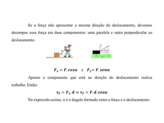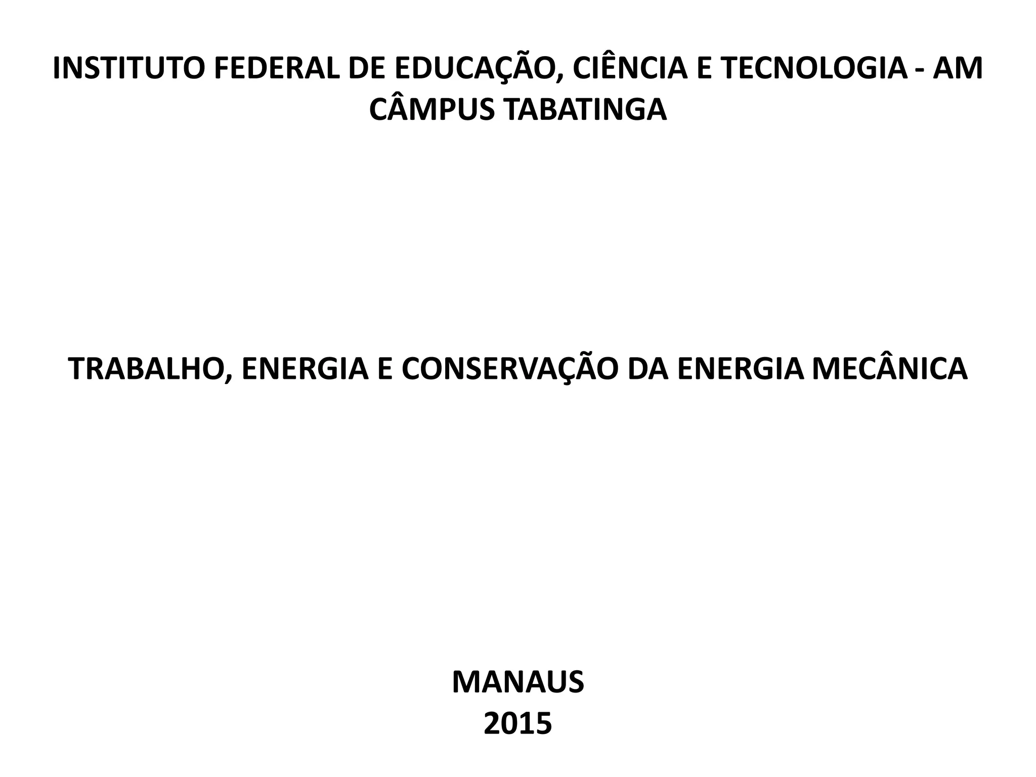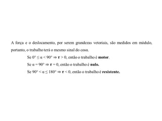 Este documento discute conceitos fundamentais de energia e trabalho mecânico, incluindo: 1) Definições de energia, trabalho e suas unidades de medida; 2) Transformações entre energia cinética e potencial gravitacional e elástica; 3) O Teorema da Energia Cinética e a Conservação da Energia Mecânica.