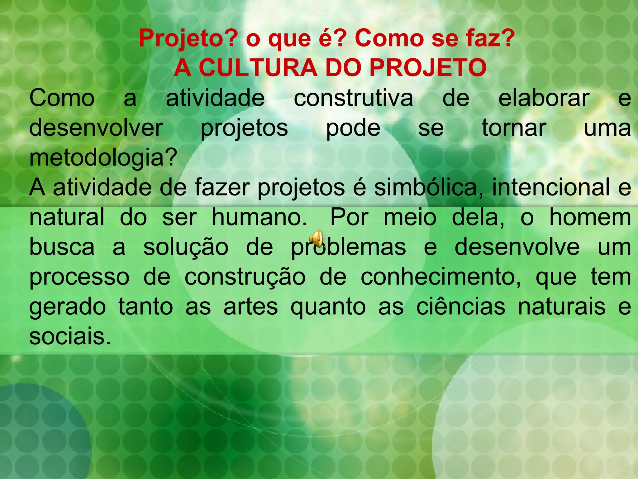Este documento discute o que é um projeto e como eles podem ser usados como uma metodologia de aprendizagem. Ele explica que projetos são uma atividade natural do ser humano para resolver problemas e desenvolver conhecimento. Aprendizagem por projeto se refere à formulação de questões pelo aluno para construir conhecimento, diferente de ensino por projeto que se refere a projetos planejados pelos professores.