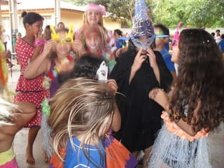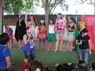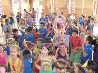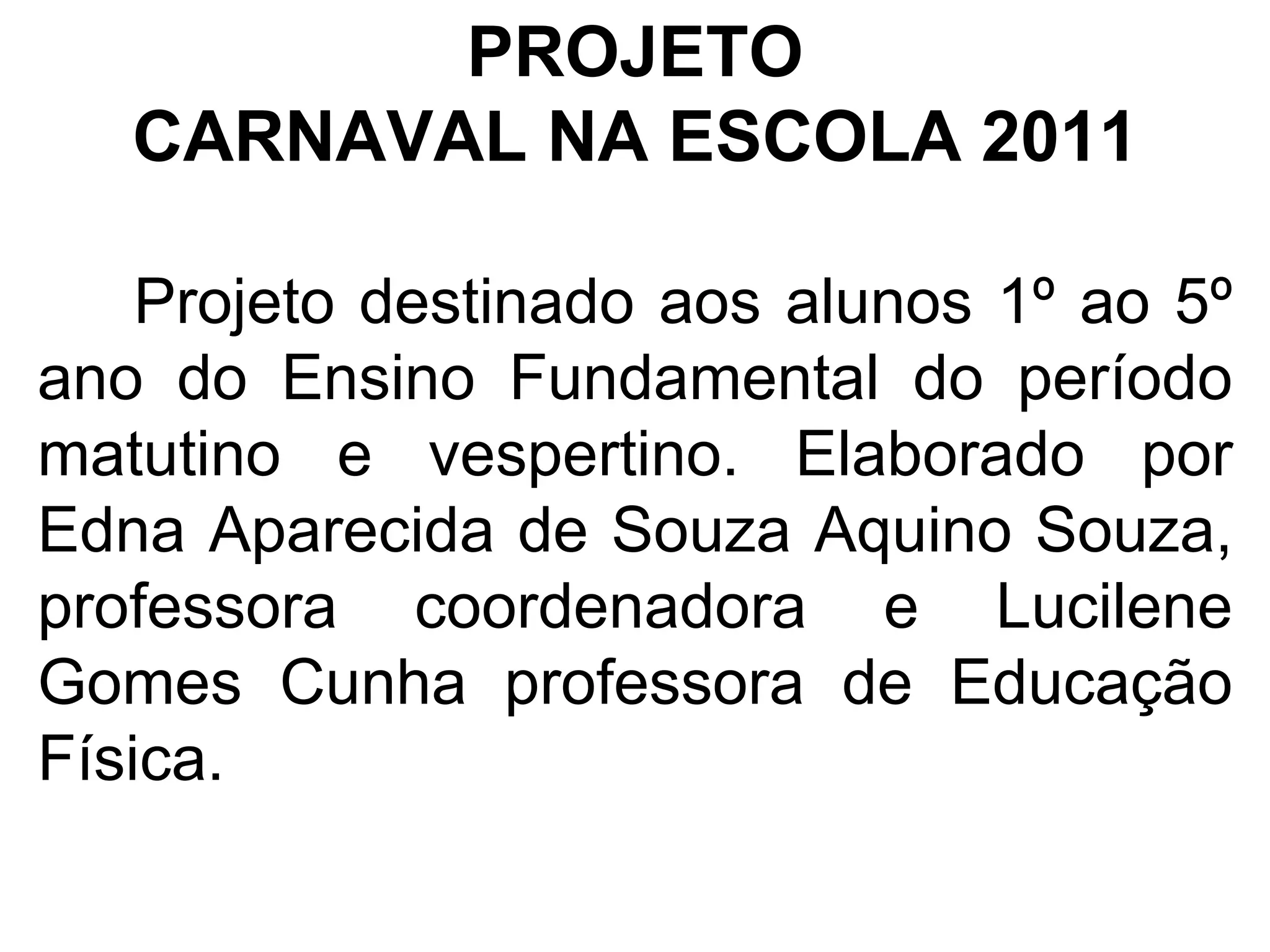 O projeto propõe atividades sobre o Carnaval para alunos de 1o ao 5o ano, com objetivos de ensinar sobre a origem e características da festa, identificar músicas e danças típicas, e promover a participação dos alunos na confecção de fantasias e máscaras. As atividades incluem contar a história do Carnaval, apresentar músicas e danças, e um desfile no pátio da escola no qual os alunos se fantasiarão.