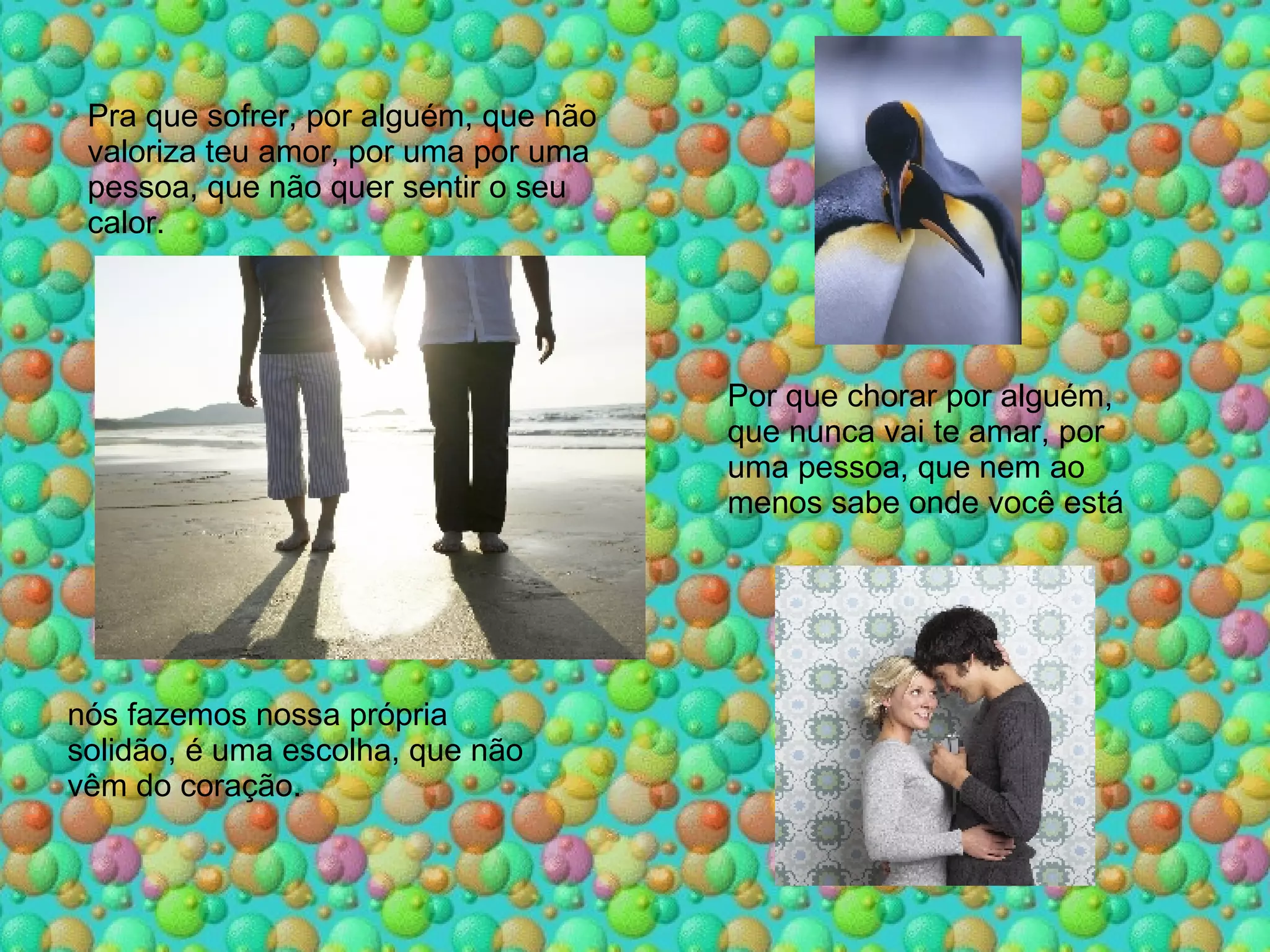 O documento discute sobre não sofrer por alguém que não valoriza o seu amor ou quer sentir o seu calor. Também fala sobre não chorar por alguém que nunca vai amar você e nem sabe onde você está. Por fim, diz que só deixará de amar quando morrer, pois mesmo na sepultura haverá uma rosa branca declarando seu amor.