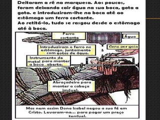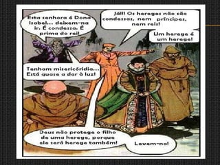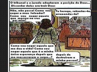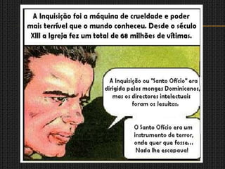 A Igreja Católica reagiu à Reforma Protestante criando a Inquisição, o Índex de Livros Proibidos e a Companhia de Jesus. O Concílio de Trento reafirmou os dogmas católicos e tomou medidas para moralizar o clero. A Inquisição perseguia hereges, judeus e protestantes, utilizando a tortura para obter confissões em julgamentos secretos, condenando muitos à morte nas cerimônias públicas de autos de fé.