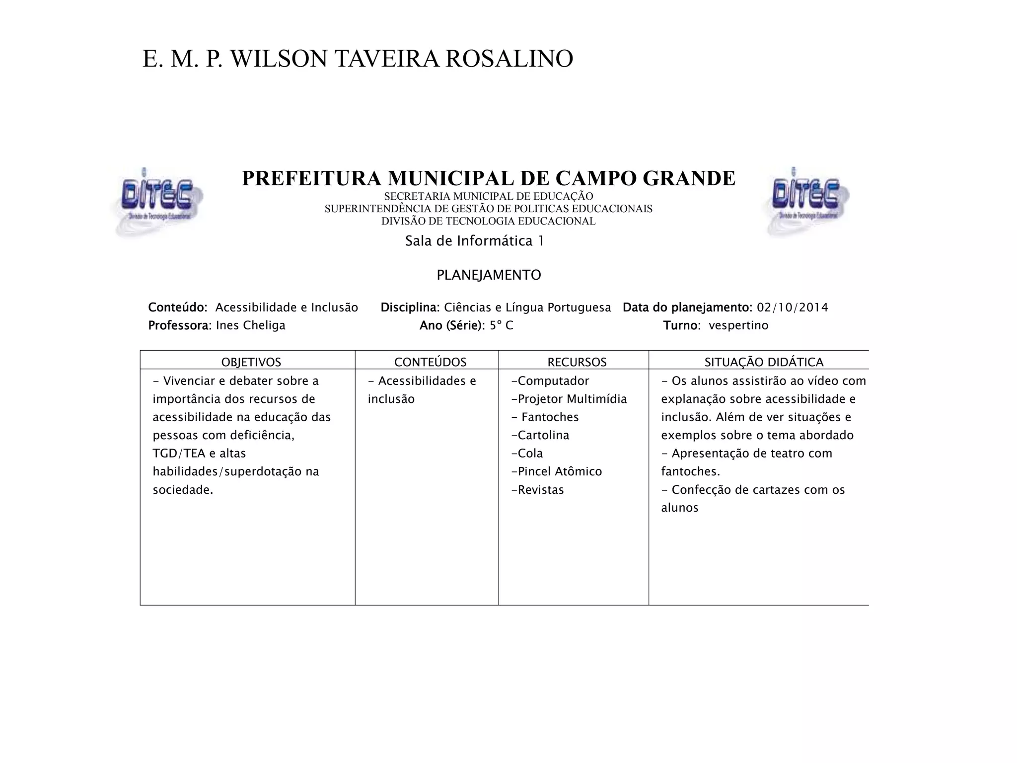 Este planejamento de aula trata da acessibilidade e inclusão. Os objetivos são vivenciar e debater a importância dos recursos de acessibilidade na educação de pessoas com deficiência ou necessidades especiais. Os alunos assistirão a um vídeo sobre o tema e farão uma apresentação de teatro com fantoches e cartazes.