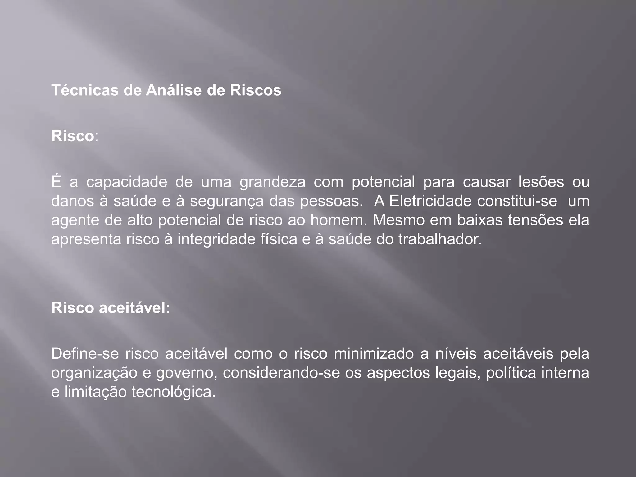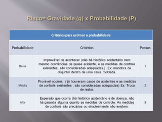 1) O documento discute técnicas de análise de riscos, incluindo a definição de risco, risco aceitável e controle de risco.
