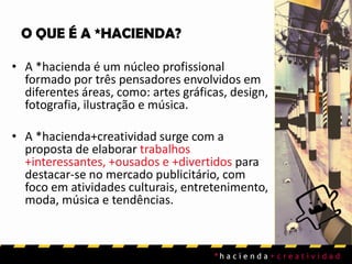 A Hacienda é uma agência criativa formada por três profissionais de áreas como artes gráficas e música. Eles criaram uma loja online para vender camisetas e acessórios com estampas originais, visando o público jovem e cultural entre 16-35 anos, principalmente na região Sul. O site terá novidades, agenda cultural e cadastro para promoções exclusivas.