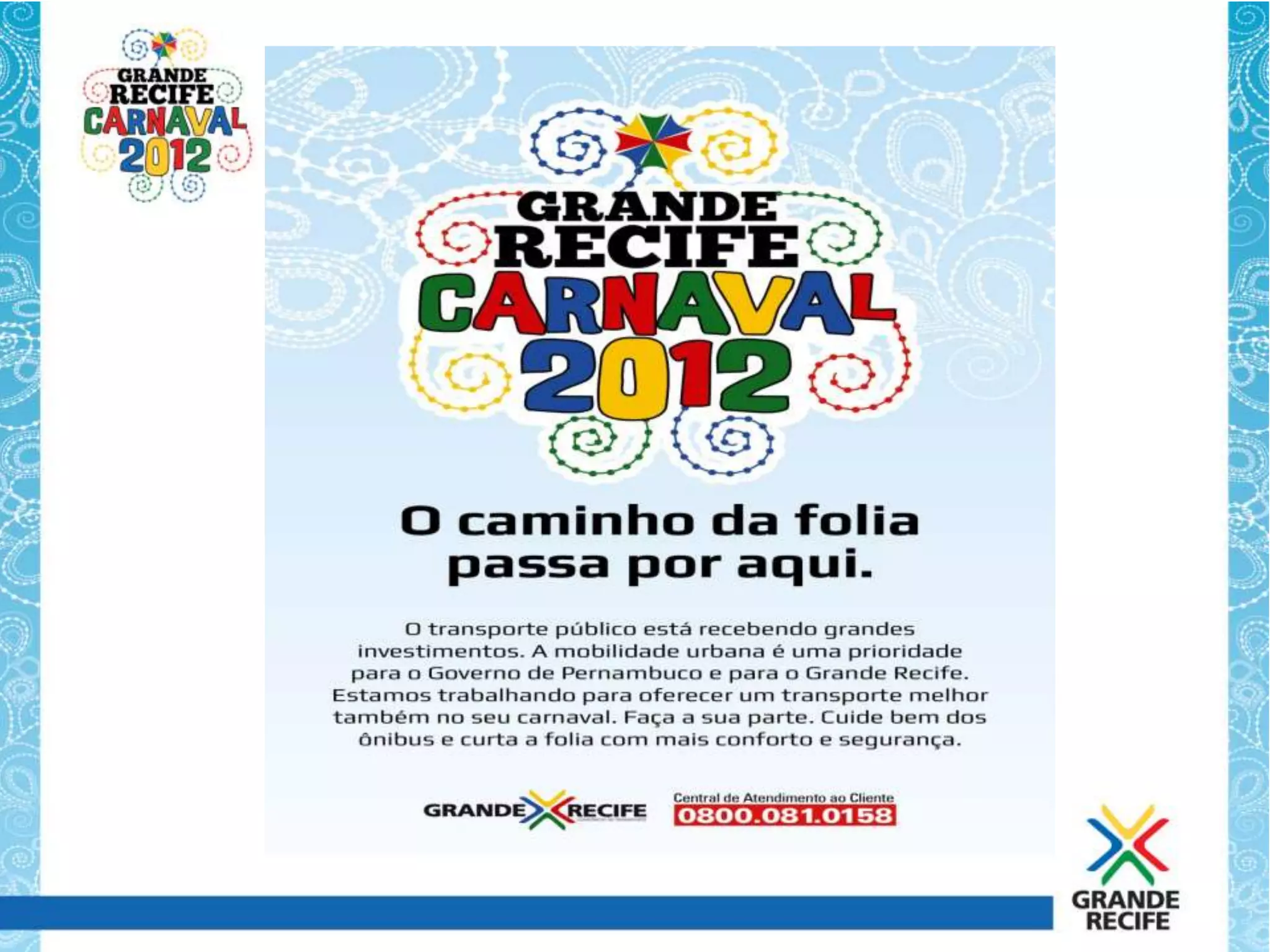 Durante o carnaval, a operação de transporte público em Recife e Olinda será reforçada com centenas de linhas adicionais, milhares de viagens extras e alterações de itinerário. Mais de 100 divulgadores e fiscais monitorarão a operação para atender a estimativa de 900 mil usuários. Linhas especiais circularão entre os principais pontos de festa.