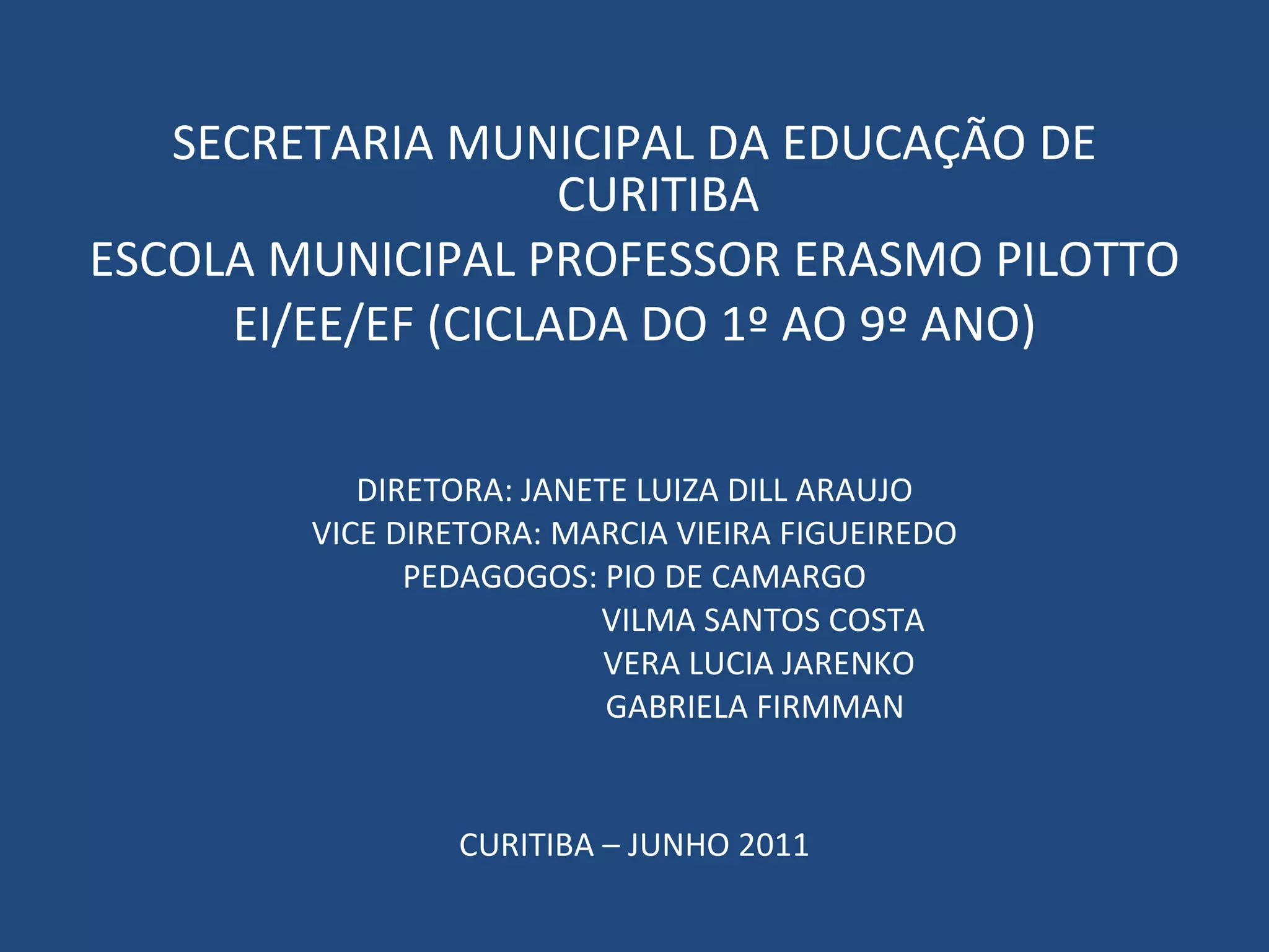 O documento descreve a história e o funcionamento da Cooperativa Escolar Professor Erasmo Pilotto em Curitiba. A cooperativa foi fundada em 1975 e mudou-se para sua sede atual em 1997. Ela é composta por representantes da escola e da comunidade e tem como princípios a gratuidade, transparência financeira e gestão democrática. A cooperativa enfrenta desafios como rotatividade de pessoal e dificuldades de participação da comunidade.