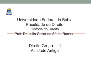 O documento discute a organização política da Atenas antiga no período democrático, após as reformas de Sólon no século VI a.C. Descreve as principais instituições políticas como a Eclésia, Boule e Heliéia e o papel da retórica e dos oradores na sociedade ateniense. Também menciona importantes pensadores e oradores como Demóstenes e os sofistas que influenciaram o pensamento e o direito na época.