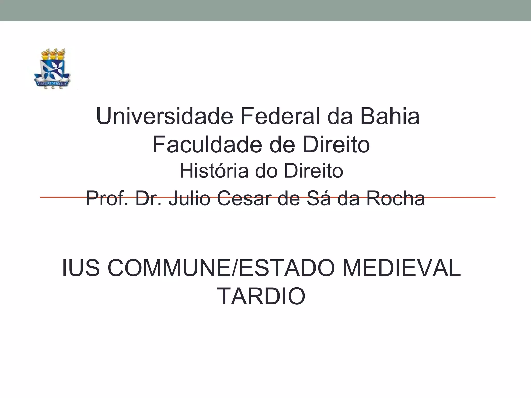2) Apresenta as características do direito feudal, canônico e do ius commune no período, assim como o surgimento das universidades medievais.