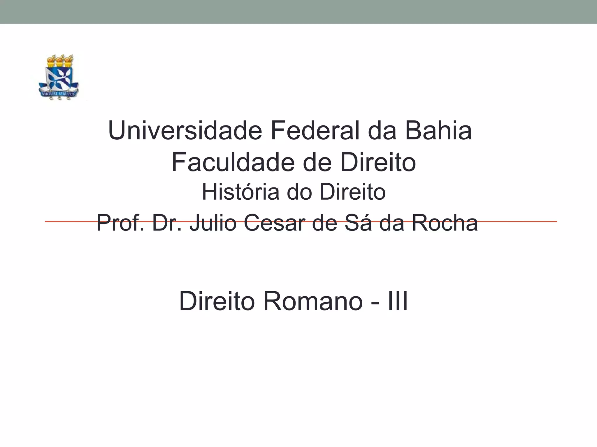 O documento descreve as principais fases do Direito Romano, desde sua origem até o período do Império Bizantino. Resume as características do Direito Arcaico, Clássico e Tardio, além de abordar a influência do Cristianismo no Direito Romano e as codificações de Justiniano no Corpus Juris Civilis. Por fim, explica como o Direito Romano continuou a ser aplicado no Império Bizantino por meio do direito vulgar.