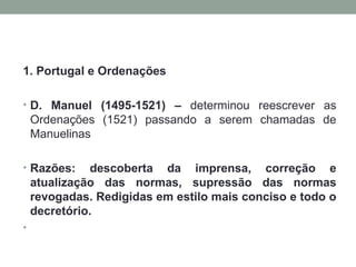 1) Portugal determinou reescrever as Ordenações em 1521 para atualizar as normas e torná-las mais concisas.
