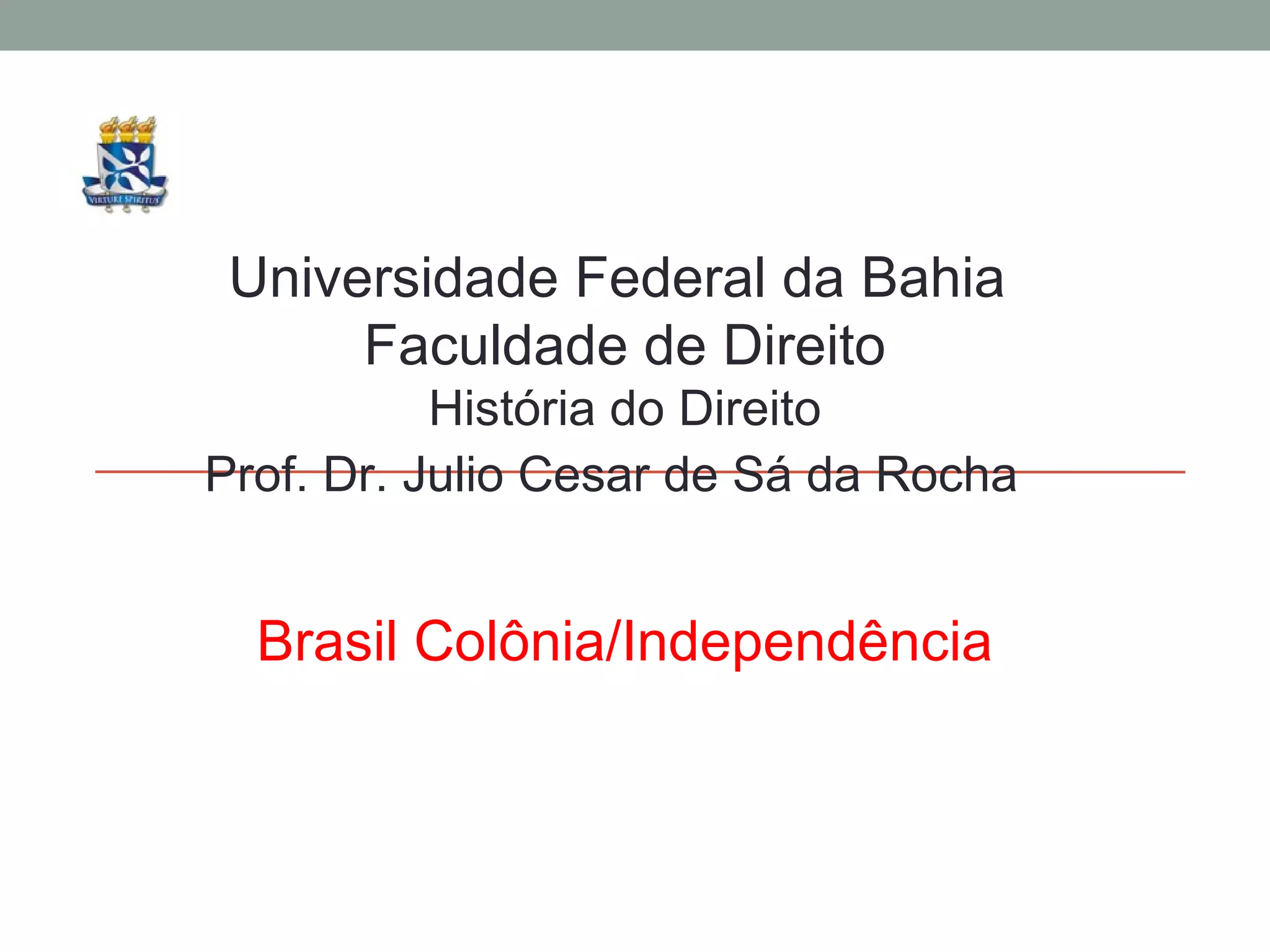 O documento descreve a história do Brasil no período da Colônia/Independência, cobrindo tópicos como a chegada da Família Real Portuguesa ao Brasil em 1808, revoltas contra o governo de D. João VI, a independência declarada por D. Pedro I em 1822, a Constituição de 1824 e o Primeiro e Segundo Reinados no Brasil Imperial.