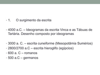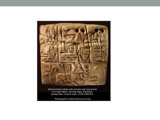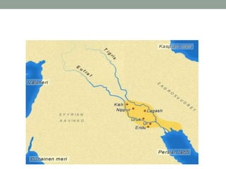O documento descreve as primeiras leis escritas na Mesopotâmia antiga, incluindo os Códigos de Ur-Nammu, Eshunna e Hamurabi. A civilização da Mesopotâmia foi o berço da escrita cuneiforme e das primeiras normas legais escritas, estabelecendo as bases para o direito nas civilizações posteriores.