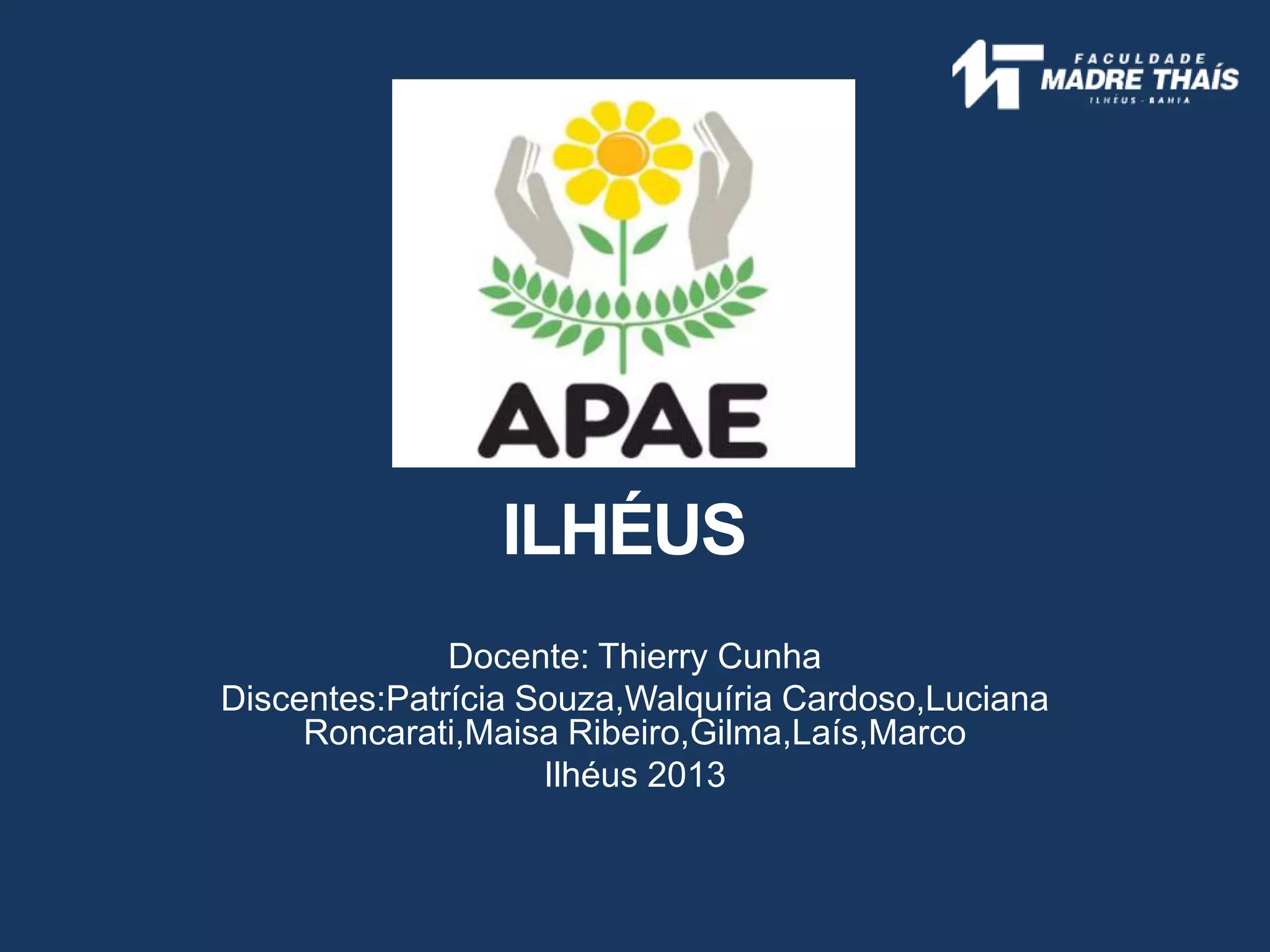 O documento descreve a Associação de Pais e Amigos dos Excepcionais (APAE) em Ilhéus, Brasil. A APAE oferece assistência integral às pessoas com deficiência intelectual e múltipla por meio de serviços como educação, saúde, capacitação profissional e inclusão social. A instituição tem como missão promover a inclusão e o bem-estar dessas pessoas na sociedade de acordo com os princípios da educação especial.