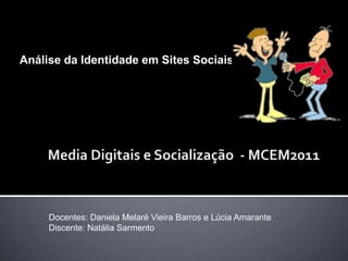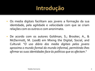 O documento analisa como jovens constroem suas identidades online através de sites sociais e mídias digitais. Duas entrevistas mostram como um rapaz e uma moça de 17 anos usam computadores, internet e celulares diariamente, principalmente para pesquisas, redes sociais e mensagens. Embora ambos usem Facebook, a moça é mais cuidadosa com informações pessoais. A conclusão é que mídias digitais oferecem liberdade na construção da identidade durante a adolescência.