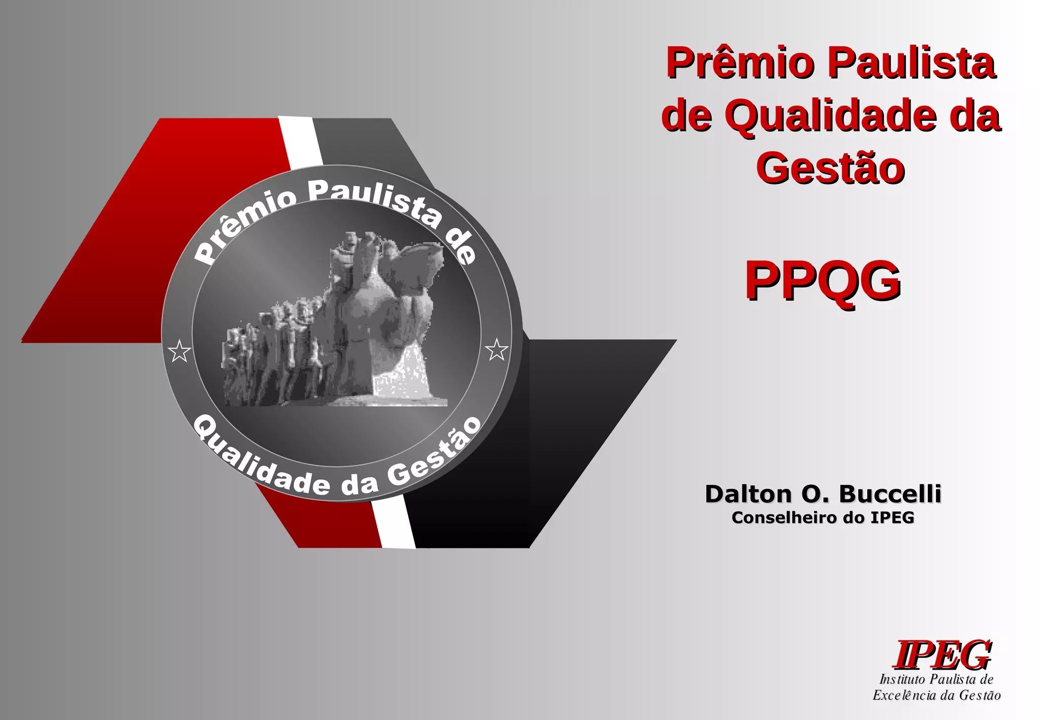 O documento descreve o Prêmio Paulista de Qualidade da Gestão (PPQG), um prêmio anual concedido pelo governo de São Paulo para reconhecer organizações públicas e privadas que se destacam em gestão, resultados e visão de futuro. O prêmio segue os critérios do Prêmio Nacional da Qualidade e é administrado pelo Instituto Paulista de Excelência da Gestão, uma organização sem fins lucrativos. O prêmio possui diferentes categorias e níveis de reconhecimento.