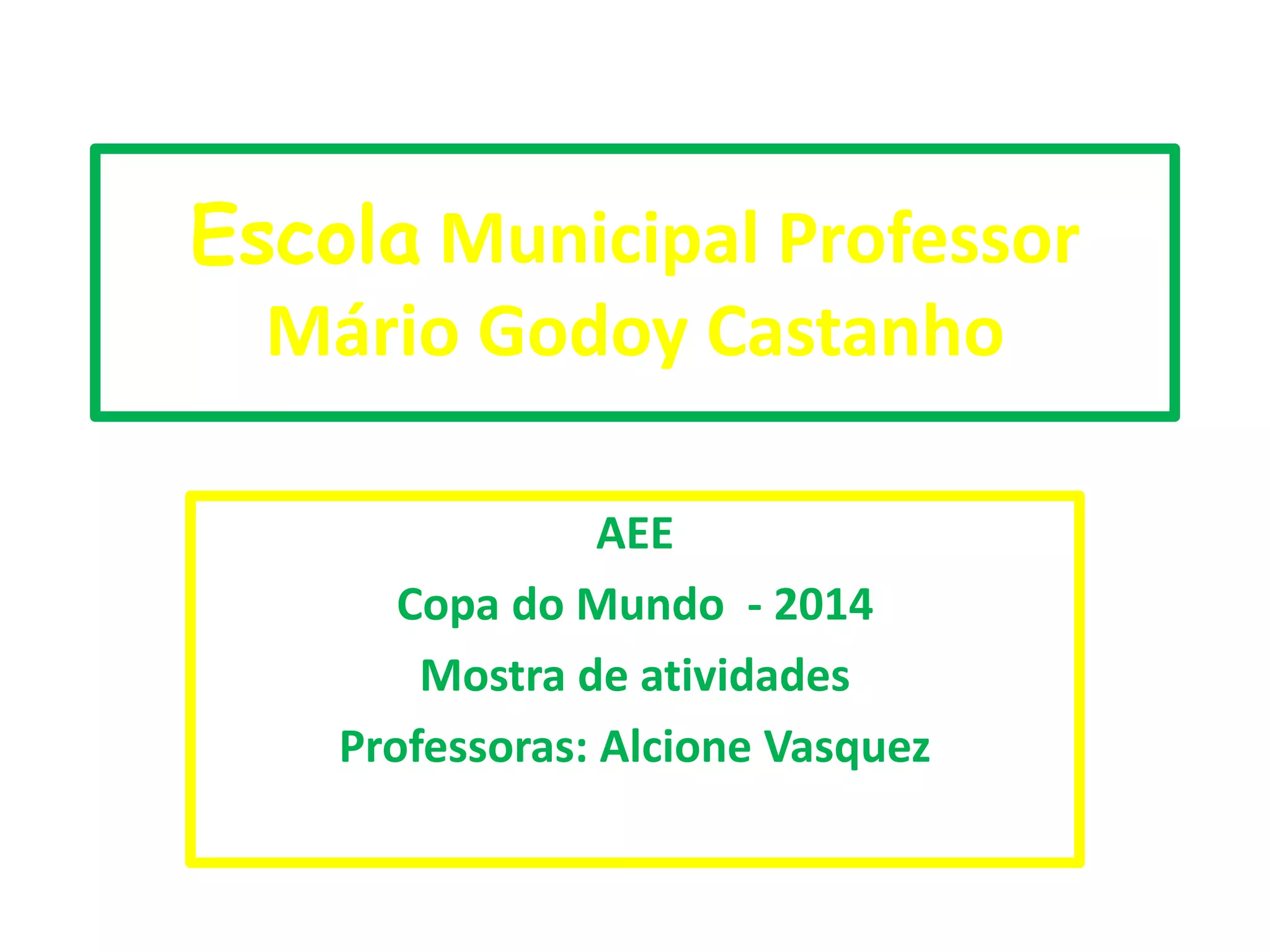 O documento apresenta atividades realizadas no contexto da Escola Municipal Professor Mário Godoy Castanho relacionadas à Copa do Mundo de 2014. As atividades foram organizadas pela professora Alcione Vasquez. O foco está em mostrar o engajamento e a criatividade dos alunos durante esse evento esportivo.