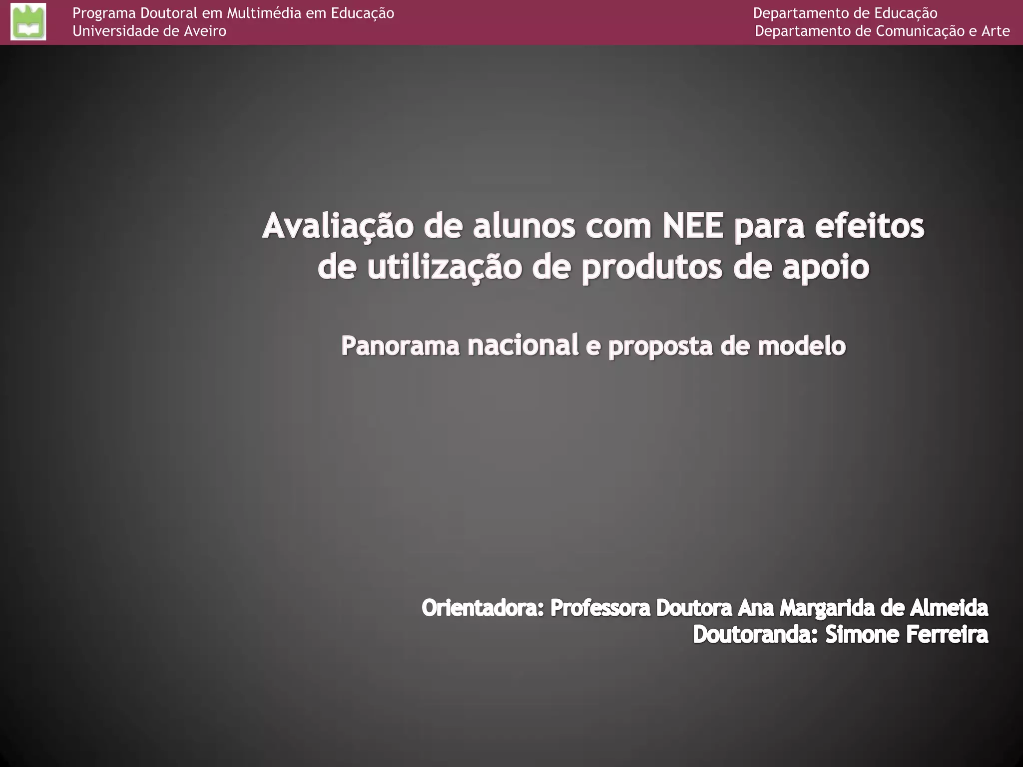 Este documento descreve um estudo de doutoramento sobre a avaliação de alunos com necessidades educativas especiais para fins de atribuição de produtos de apoio tecnológico. O estudo visa caracterizar as práticas atuais em Portugal, conceber um novo modelo de avaliação e validá-lo por meio de feedback de especialistas.